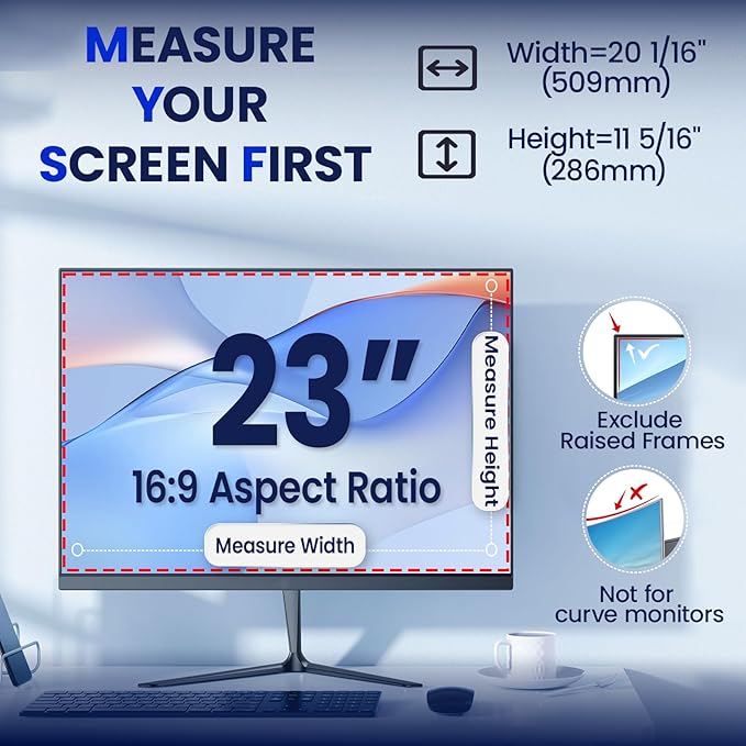 - 【Measure Your Viewable Area First】AEGIVIXE 23 inch privacy screen filter for flat computer monitor 16:10 Aspect Ratio. Ensure your screen's viewable area measures: Width: 20 1/16 (509mm); Height: 11 5/16 (286mm). Do not rely on diagonal size. Note: Not compatible with thick-edge monitors and curved computer monitors