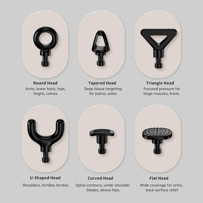 - 【12 Interchangeable Heads for Targeted Comfort】 The electric massage gun includes 6 pairs of dedicated interchangeable heads for focused application: Round, Tapered, Triangle, U-shaped, Curved, and Flat. Each head is designed to provide tailored support to different body areas, helping to relax specific muscle zones