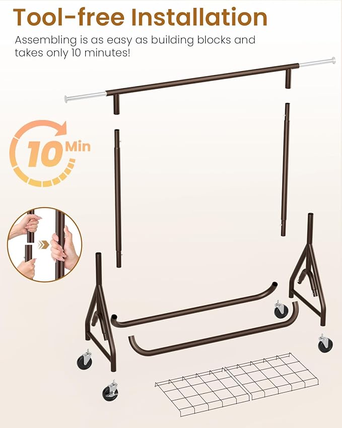 - ๐๐ผ๐๐ ๐๐ ๐ผ๐๐๐๐๐ฝ๐๐: The hanging clothes rack has been carefully designed with simple components, no need to worry about missing parts and tools. Secondary installation or disassembly can be done in 1 minute without tools, perfect for yard sales, seasonal storage, making assembling metal clothes rack easy and simple, saving you a lot of time. You can assemble our rolling racks with the help of the instructions or refer to our installation video.