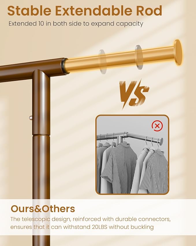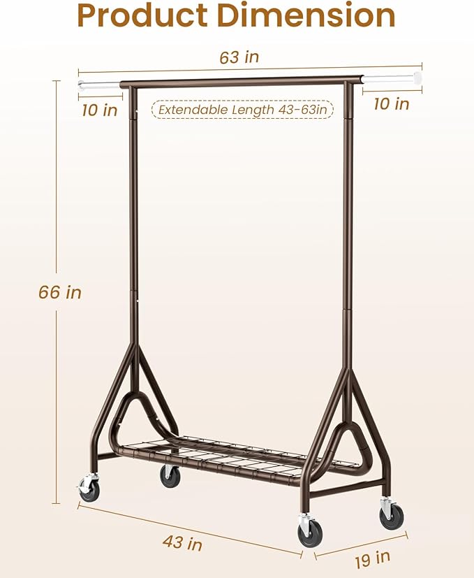 - ๐ผ๐ฟ๐ ๐๐๐๐ผ๐ฝ๐๐ ๐๐๐๐๐๐: The heavy duty clothes rack features a user - friendly adjustable design. The horizontal rod extends from 43in to 63in. This adaptability makes it perfect for any space such as living room, bedroom, laundry, yard sales, clothing live streaming, shopping malls and so on.