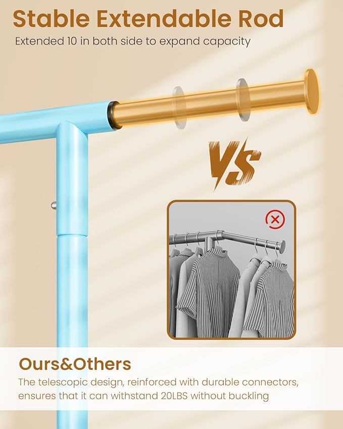 - ๐ผ๐ฟ๐ ๐๐๐๐ผ๐ฝ๐๐ ๐๐๐๐๐๐: The heavy duty clothes rack features a user - friendly adjustable design. The horizontal rod extends from 43in to 63in. This adaptability makes it perfect for any space such as living room, bedroom, laundry, yard sales, clothing live streaming, shopping malls and so on.