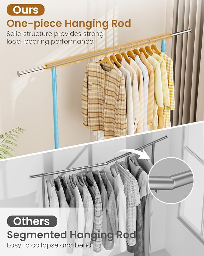 - ๐๐๐๐๐ฟ๐ ๐ผ๐๐ฟ ๐๐๐ผ๐ฝ๐๐ ๐พ๐๐๐๐๐๐๐พ๐๐๐๐: Our clothes rack adopts an innovative one-piece rod design, which ensures that the clothing rack are evenly supported, preventing sagging or bending. The triangle on the sides and dual U-shade rods on the bottom make the heavy duty clothing rack more stable and sturdy. The rolling rack can hold up to 450 pounds, so you can hang up heavy clothing, place luggage and more without worry.