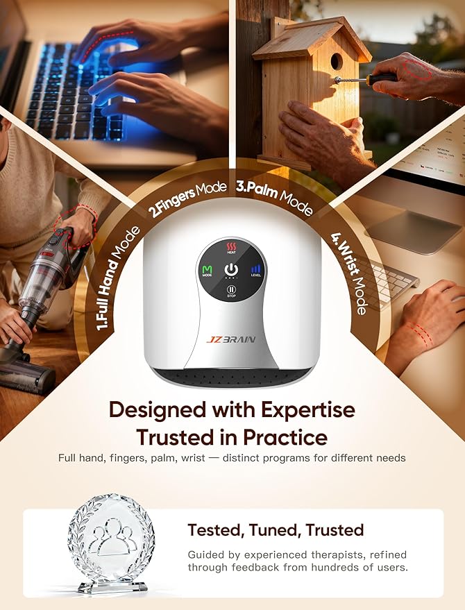 - 【JZBRAIN Hand Massager for Daily Comfort】 Unlike other products that only press the hand up and down at once, our hand massager uses five sections that work in sequence. This wave-like rhythm guides your palm and fingers through a natural flex-and-open motion, bringing gentle movement to the whole hand. It helps ease the strain from office work, housework, crafting, driving, or gaming—so your hands feel lighter and more at ease.