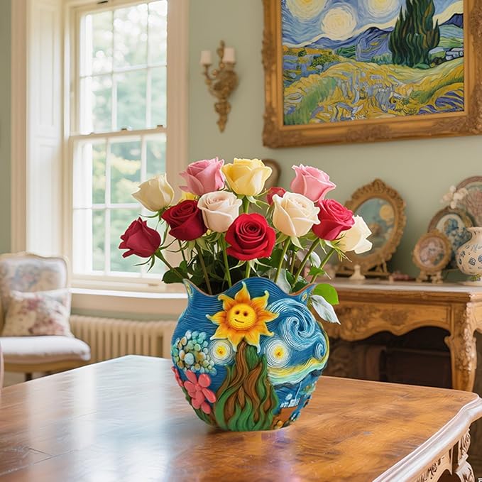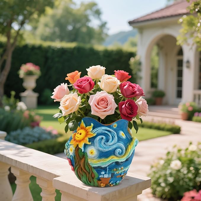 - Starry Night Inspired Planter: Bring the magic of Starry Night into your home with this resin flower pot. The swirling blue sky, radiant sunflower, and vivid floral details transform a simple planter into an art-inspired statement piece