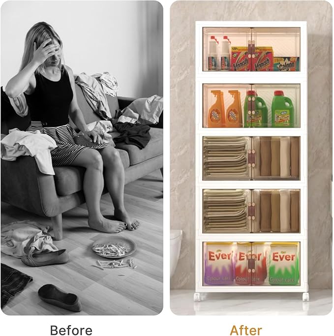 - 【Maximize Vertical Space with Collapsible Design】:Easily fold down to JUST 2.6 inches each tiers when not in use. Especially when you want to move house, you don't need to move bulky cabinets and worry about them being damaged due to transportation. It is a good alternative idea to fixed furniture cabinets and small miscellaneous boxes!