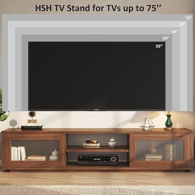 HSH 70" TV Stand for 75 inch TVs,Entertainment Center for Living Room with Storage,Farmhouse Walnut TV Stand Wood with Sliding Doors,Low Media Console Cabinet for Bedroom