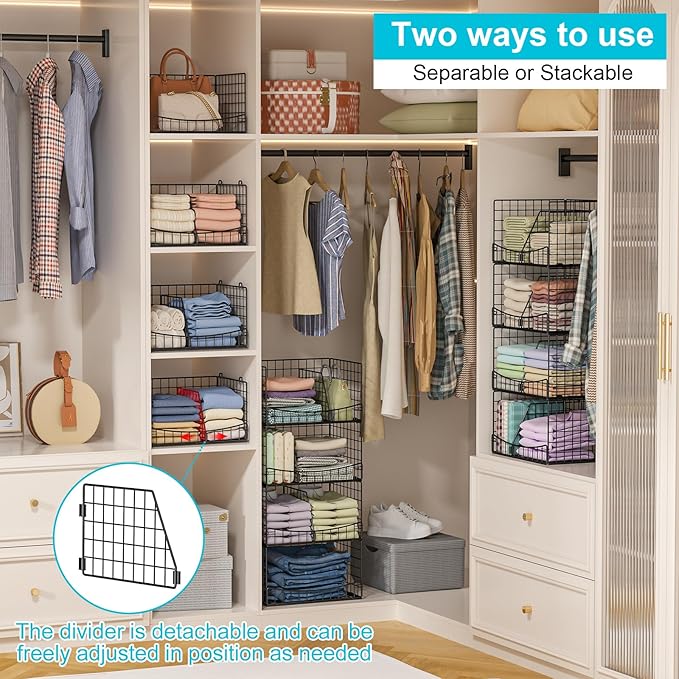 4-Tier Closet Organizers and Storage Shelves with Divider, Stackable Closet Shelf Organizer Basket Bins, Clothing Sweaters Storage Container for Wardrobe Cupboard, Black