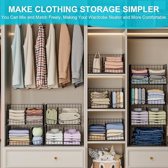 - Multi-Functional: The 4-tier stackable closet organizer bins are perfect for storing clothes, snacks, drinks, and more. Ideal for the bedroom, kitchen, living room, office, or study areas. Keep your items neat and organized, away from the mess