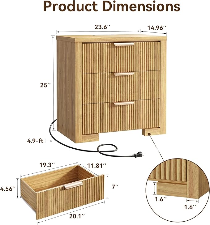 Fluted Nightstand Set of 2 with Charging Station, 23.6" Night Stand with 3 Drawers,End Table with Storage, Bed Side Table for Bedroom,Modern Nightstand for Living Room, Natural