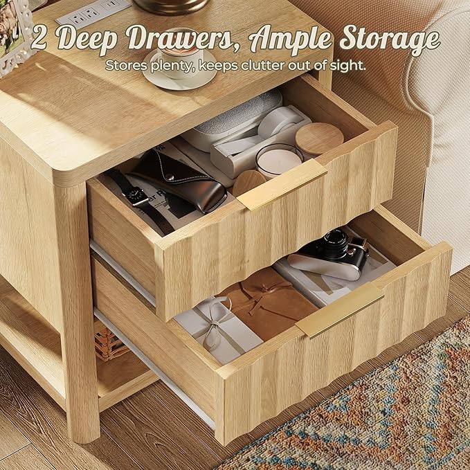 Huuger 27.6 Inch Tall Night Stand with Charger Station, USB-C Port, Fluted Nightstand with 2 Deep Drawers, Larger Wider Bed Side Table with Open Shelf, Bedroom Living Room End Table, Natural