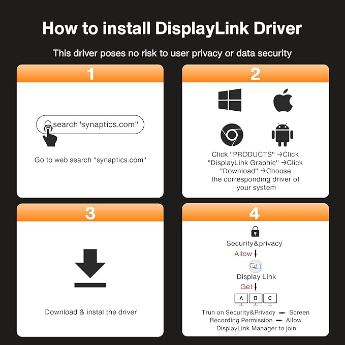 - 【DisplayLink DRIVER NOTE】For the normal operation of this 20-in-1 docking station, please install the corresponding DisplayLink driver version before running your devices; the HDMI/DP 1&2 ports only work when the proper driver is installed for your dock. This driver poses no risk to user privacy or data security.