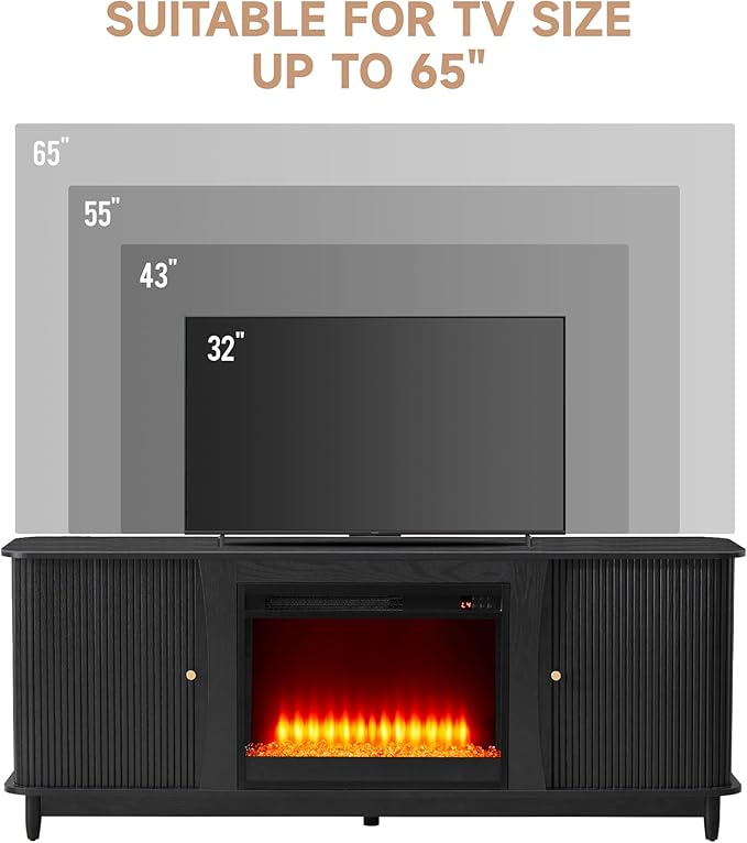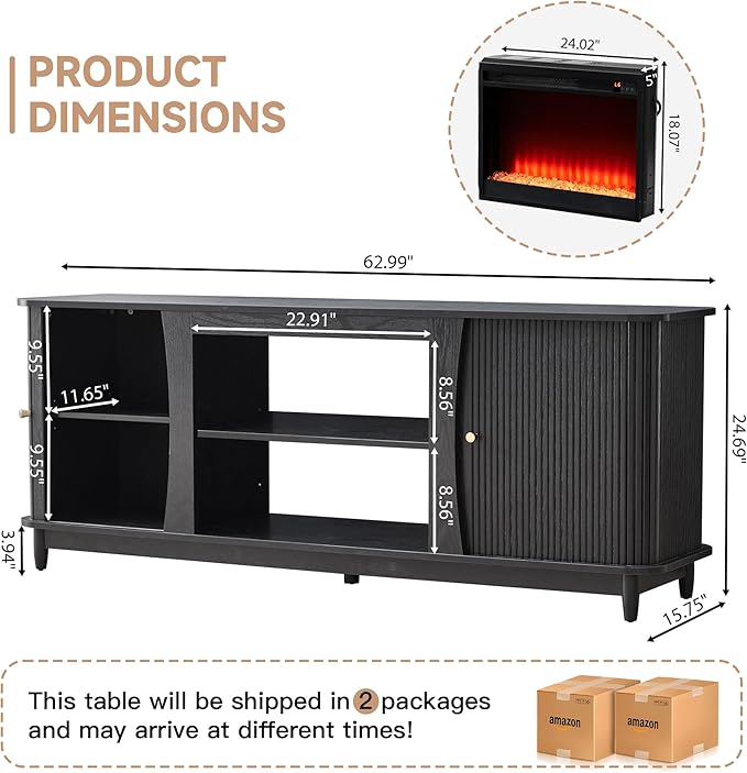 - Versatile Console Table: Overall Dimensions (15.75 "D x 62.99 "W x 24.69 "H). This electric fireplace TV stand creates a cozy atmosphere during colder months, while the option to switch to a shelf creates a minimalist, stylish look. The curved table edges add a modern, soft feel while also enhancing safety, making it ideal for homes with kids and pets. It can be used as a display cabinet, TV stand, or storage table, perfectly fitting into your living room, bedroom, apartment, or office.