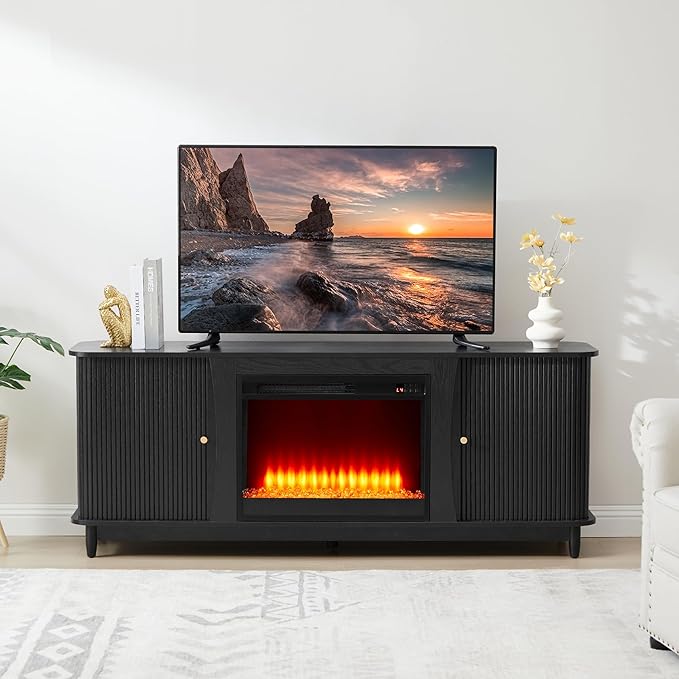 Fireplace TV Stand, Fluted TV Stand with Storage and Sliding Door, Farmhouse Entertainment Center Media Console Table for Living Room (Black)