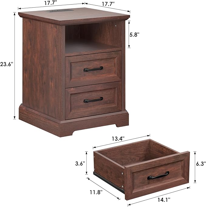 - 【Ample Storage Space】Our nightstand combines style and functionality with two drawers and an open shelf, offering ample storage for everything from personal essentials to household items. Measuring 17.72"D x 17.72"W x 23.62"H, it fits perfectly in living rooms, bedrooms, and more. Designed to complement any bedroom decor, this versatile piece ensures that your essentials are always within reach.