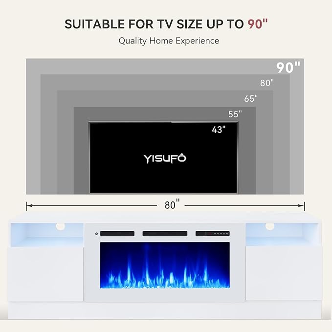 - TV Stand with Electric Fireplace: Our fireplace TV stand is equipped with a white 36" electric fireplace, which comes with 12 colors of backlight, 12 colors of light strip, 12 flame colors and 5 levels of flame brightness, providing different viewing experience and ambience with the remote control