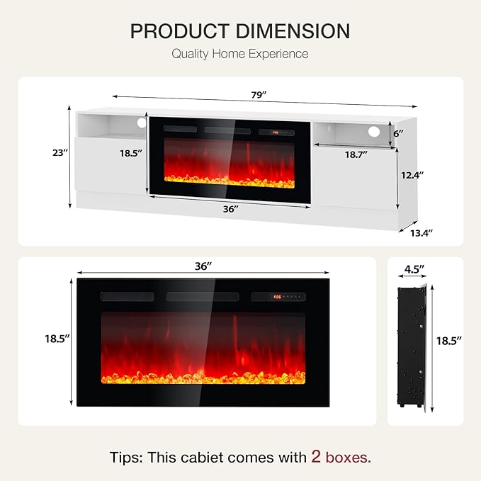 - TV Stand with Electric Fireplace: Our fireplace TV stand is equipped with a white 36" electric fireplace, which comes with 12 colors of backlight, 12 colors of light strip, 12 flame colors and 5 levels of flame brightness, providing different viewing experience and ambience with the remote control