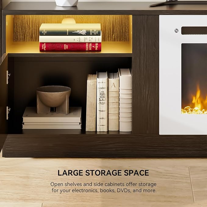 - Ample Storage Space: Featuring a combination of open and closed cabinets, the entertainment center with fireplace is able to provide enough storage space for media devices, gaming consoles, DVDs, and other accessories
