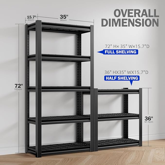 - 【FLEXIBLE DETACHABLE DESIGN】 This single 72" H x 35" W x 16" D shelf effortlessly splits into TWO separate 36" H x 35" W x 16" D units! Customize your layout for corner spaces, workshop areas, or different rooms.This innovative design provides the storage flexibility you need without buying multiple racks.