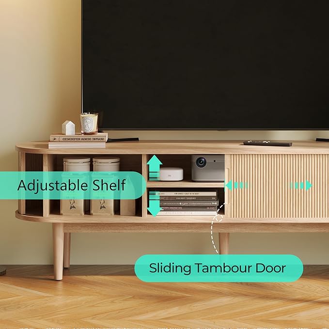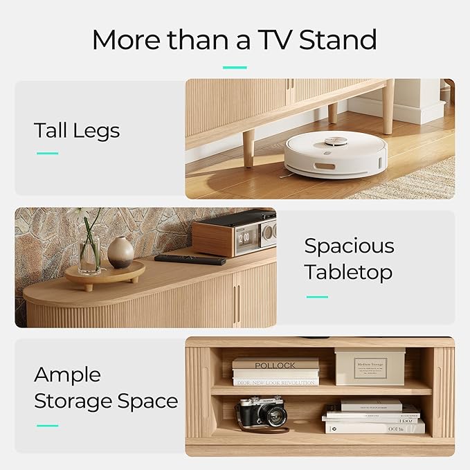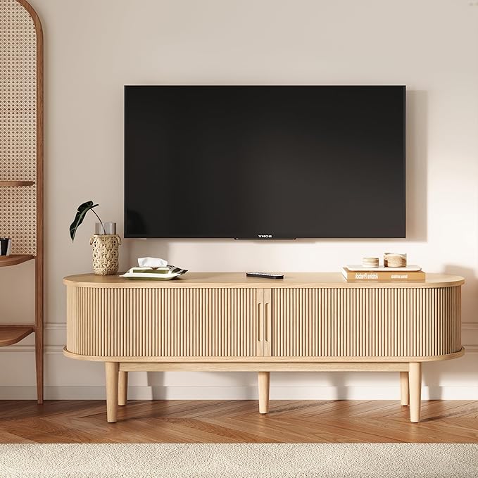 - Mid Century Modern TV Stand – Featuring a sleek, curved silhouette and fluted panel design, the entertainment center with storage brings a touch of retro sophistication to any living room or bedroom, while rich wood grain finish enhances warmth and character, effortlessly blending with both modern and traditional décor styles