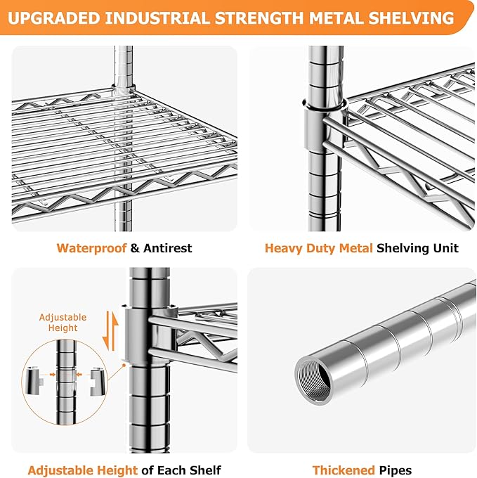- Easy to Assemble: No tools needed for this metal shelving; High-quality clips fit perfectly with support poles, and clear instructions allow one person to finish in 15 minutes; Anti-tipping measures ensure stability and safety for heavy items