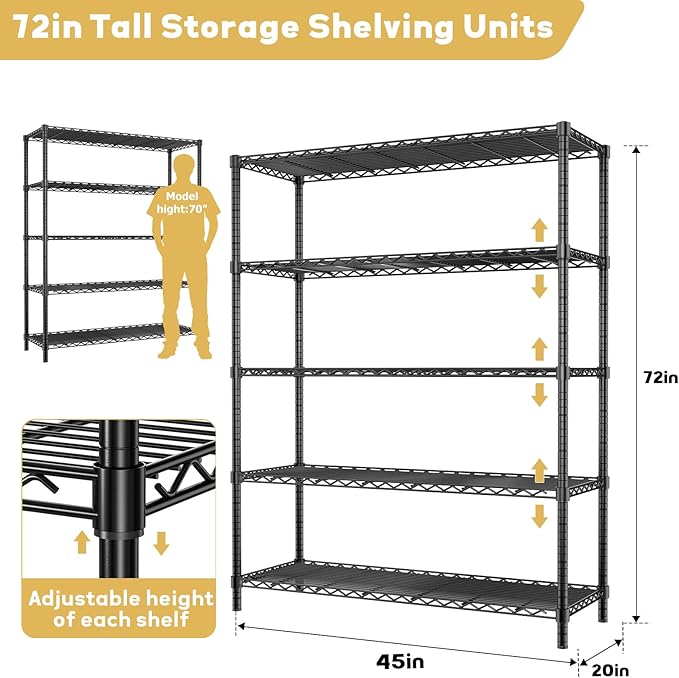 Storage Shelves Heavy Duty, 45" W x 20" D x 72" H Garage Shelving Unit Loads 2000LBS, 5-Tier Adjustable Metal Utility Rack, Wire Shelf for Kitchen, Laundry Room, Pantry, Warehouse, Basement
