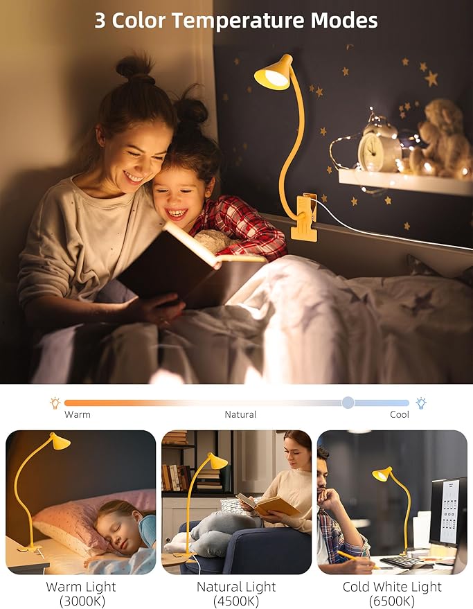- đ ăMOST COMFORTABLE LIGHTING SOURCESăThis clamp light features with 3 Lighting Modes: warm white light (3000K), natural light (4500K) and cool white light (6500K). Each modes have 10 levels Brightness, so that it create 30 illumination modes, meet all your requirements. Clip on bedside or headboard and reading in bed, comfortable light brings you comfortable life!