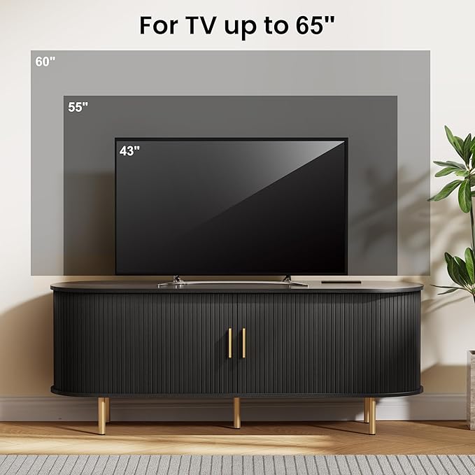 DHH 55 inch Tv Stand Cabinet with Storage,Fluted Tv Console Entertainment Center with Storage Adjustable Shelves, Modern Vintage with Sliding Doors tv Stand for Living Room (Black, 55 Inch)