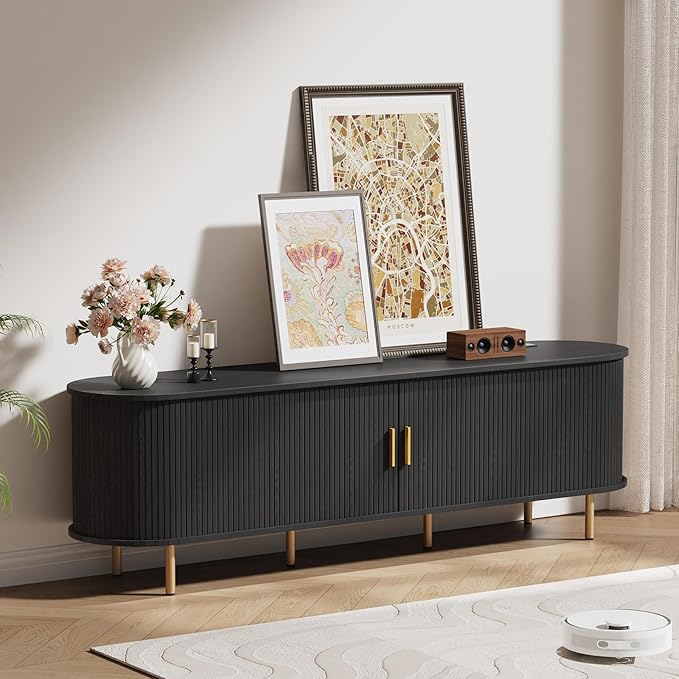 DHH 70 inch Tv Stand Cabinet with Storage,Fluted Tv Console Entertainment Center with Storage Adjustable Shelves, Modern Vintage with Sliding Doors tv Stand for Living Room (Black, 70 Inch)