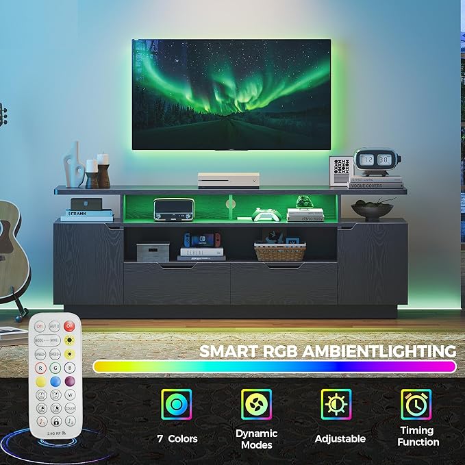 - Lighting Atmosphere: The TV console LED lights feature a 7-color adjustable light strip that can be remotely controlled. Easily switch the lights to suit your mood or occasion, illuminating the entire room and creating the perect atmosphere