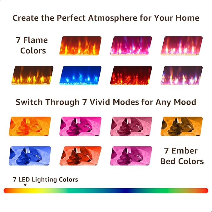 - 36" Crystal Fireplace with Customizable Ambience: The center section features a large 36" crystal fireplace insert, offering 7 flame colors and 7 ember bed colors to create the perfect mood. The display can run with or without heat, making it ideal for year-round use. Timer settings and overheat protection provide added convenience and peace of mind.