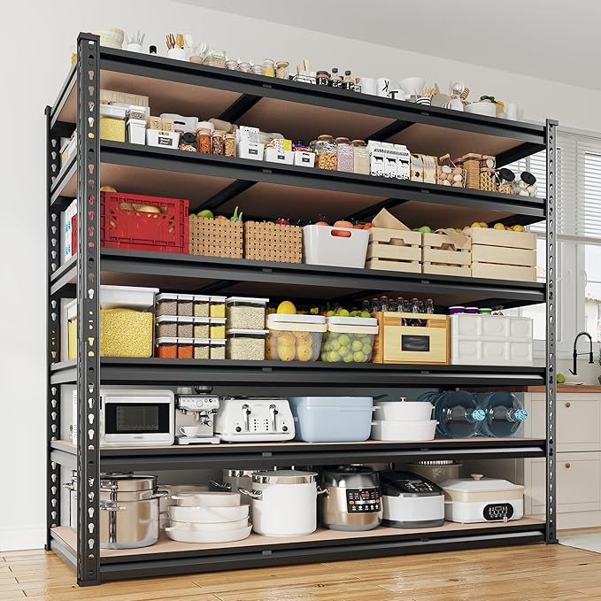 - 【Spacious 6-Tier Garage Shelving with Massive Capacity】REIBII's 84"H heavy-duty shelving delivers exceptional storage capacity. With 48.2"W x 24"D dimensions, the metal shelving accommodates all essentials from toolboxes to storage bins. Suitable for garage, storage room, closet, kitchen, warehouse, basement, living room, office and commercial use. REIBII storage shelves transform cluttered spaces into organized areas